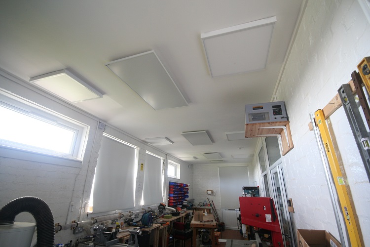 Herschel Infrared panels were specified for heating the Men’s Shed project. Slightly different ideas were used for the two large rooms, the social/kitchen area and the large workshop, and this was partly determined by the layout of the lighting system. The lighting is provided by 600mm x 600mm LED ceiling mounted panels. Colin says the Herschel heaters blend in very well with the lights, being the same width. In the social/kitchen area the lights were placed to the sides, with the heater panels neatly occupying the spaces between the lights. In workshop 2, the heaters were placed on the centre line of the ceiling. Workshop 1 has one 700W unit, and the lobby and each of the toilets have a 350W panel.