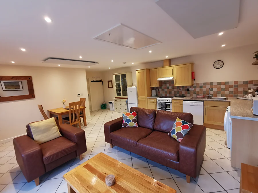 “I’m just going to take you in to Barley End which is a barn conversion / rental property we’ve recently converted to infrared heating panels. As you come into the room you might not even notice them unless you’re looking. We have 2 x 1000W panels in the kitchen plus several other panels in the bedrooms and hallway. The control panel is here, we largely keep it locked so we can control the system from anywhere in the world using the really useful App.