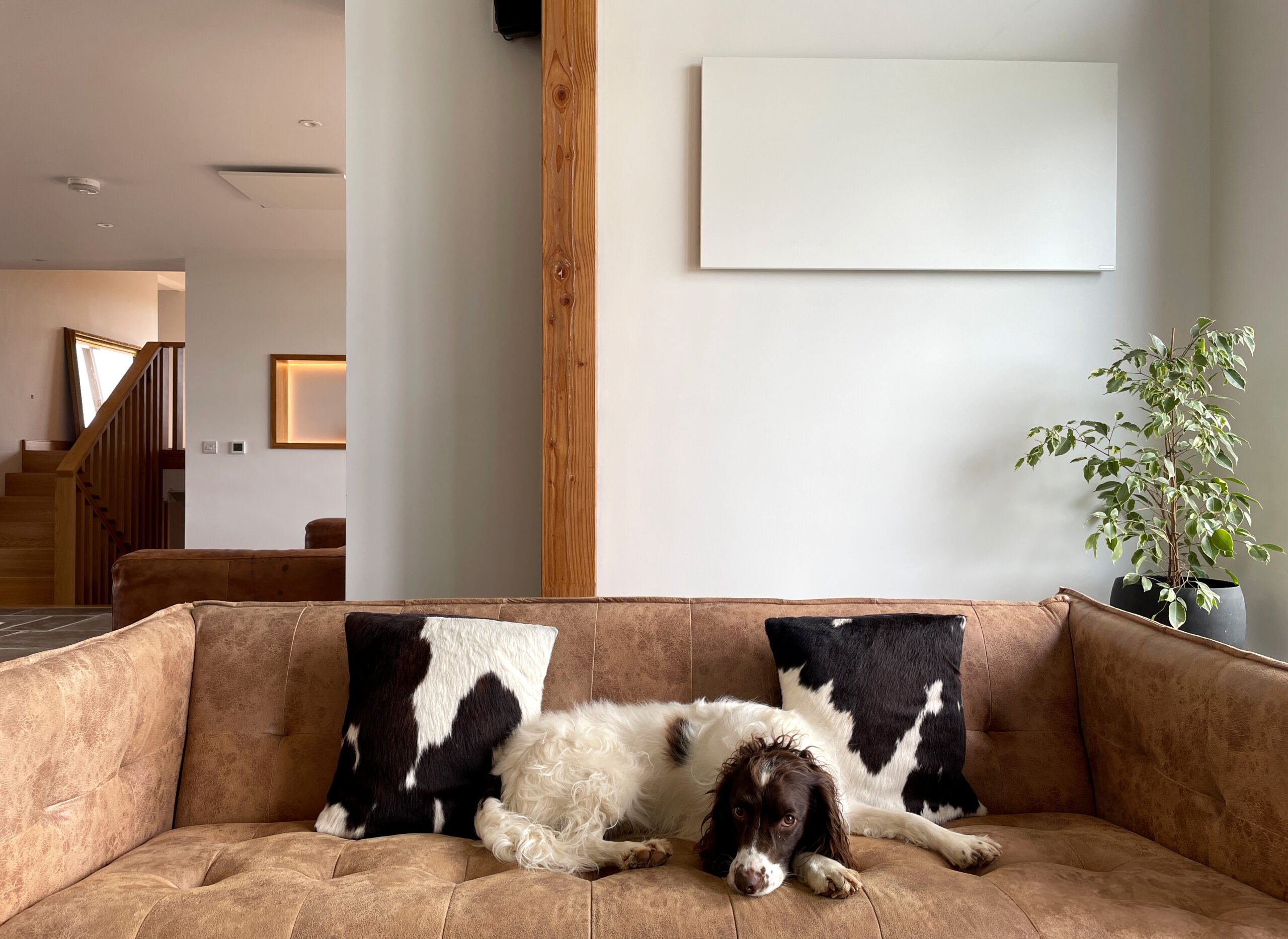 Alongside the infrared heating technology, Sophie wanted the house to be entirely electric. The fully electric home is equipped with 55 solar panels with plans to install a battery system at a later date. “Solar panels are very important as part of that integration, which obviously means that our heating is effectively, we’re as close to being able to be off the grid as it’s possible. We are attached to the grid, but we’ve been positive in our usage throughout the winter.”