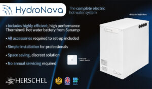 The Herschel HydroNova is a compact, tankless hot water system delivering mains-pressure hot water on demand using advanced phase change technology. Paired with Sunamp’s Thermino© hot water battery, HydroNova charges using off-peak or solar electricity, offering high efficiency and reduced space requirements—less than a third of a traditional cylinder. Maintenance-free and solar-ready, HydroNova eliminates standby heat loss, providing consistent, energy-efficient hot water on demand. 10-year warranty included.